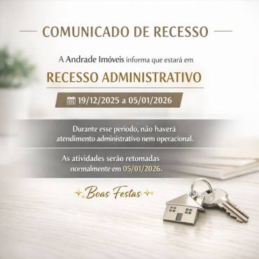 A Andrade Imóveis comunica que estará em recesso administrativo no período de 19/12/2025 a 05/01/2026, conforme organização interna da empresa.